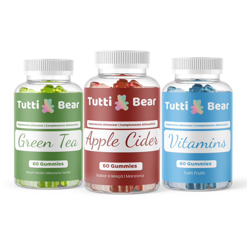 The Energy & Focus Bundle contains Green Gummies, Apple Cider Vinegar, and Vitamins to help: